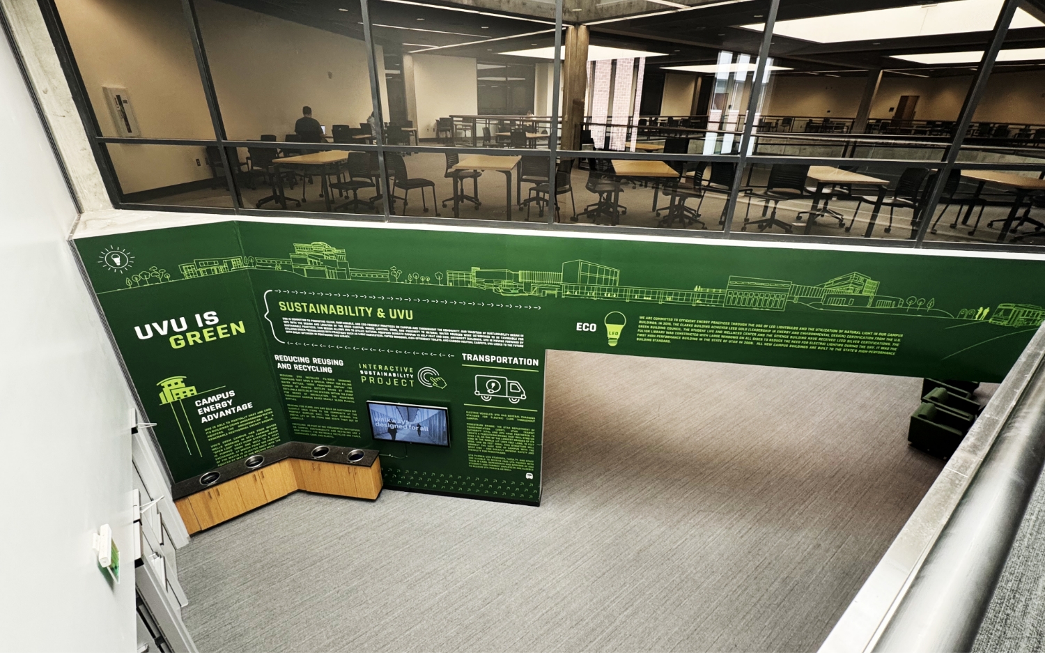 The UVU Sustainability Wall, an interactive and educational installation located outside the Ballroom in the Sorensen Center. The wall was created to highlight UVU’s commitment to environmental stewardship and its goal of reaching carbon neutrality by 2050.